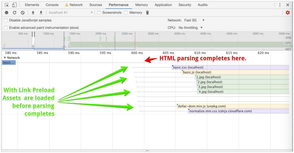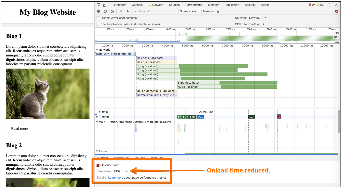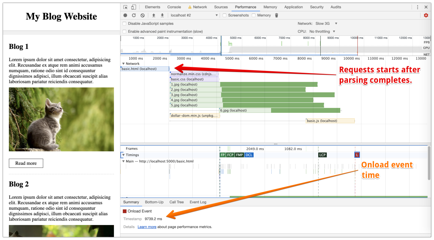 Let’s see this in action. I have created two html pages, one without any optimizations and other with link preload enabled. Let’s see how both these pages perform. We can measure this by looking the difference in DomContentLoaded, onLoad, FirstPaint and First Contentful Paint.